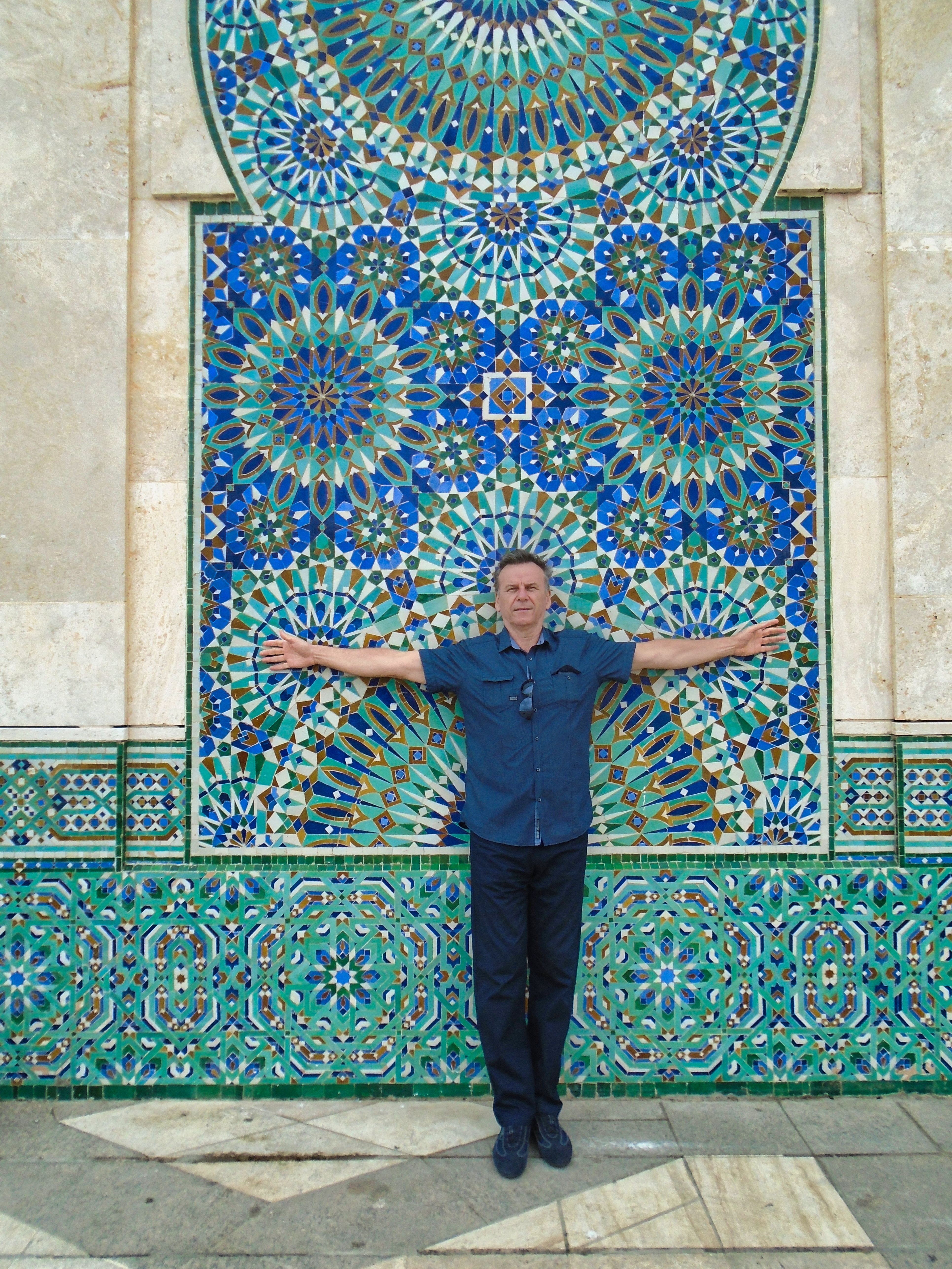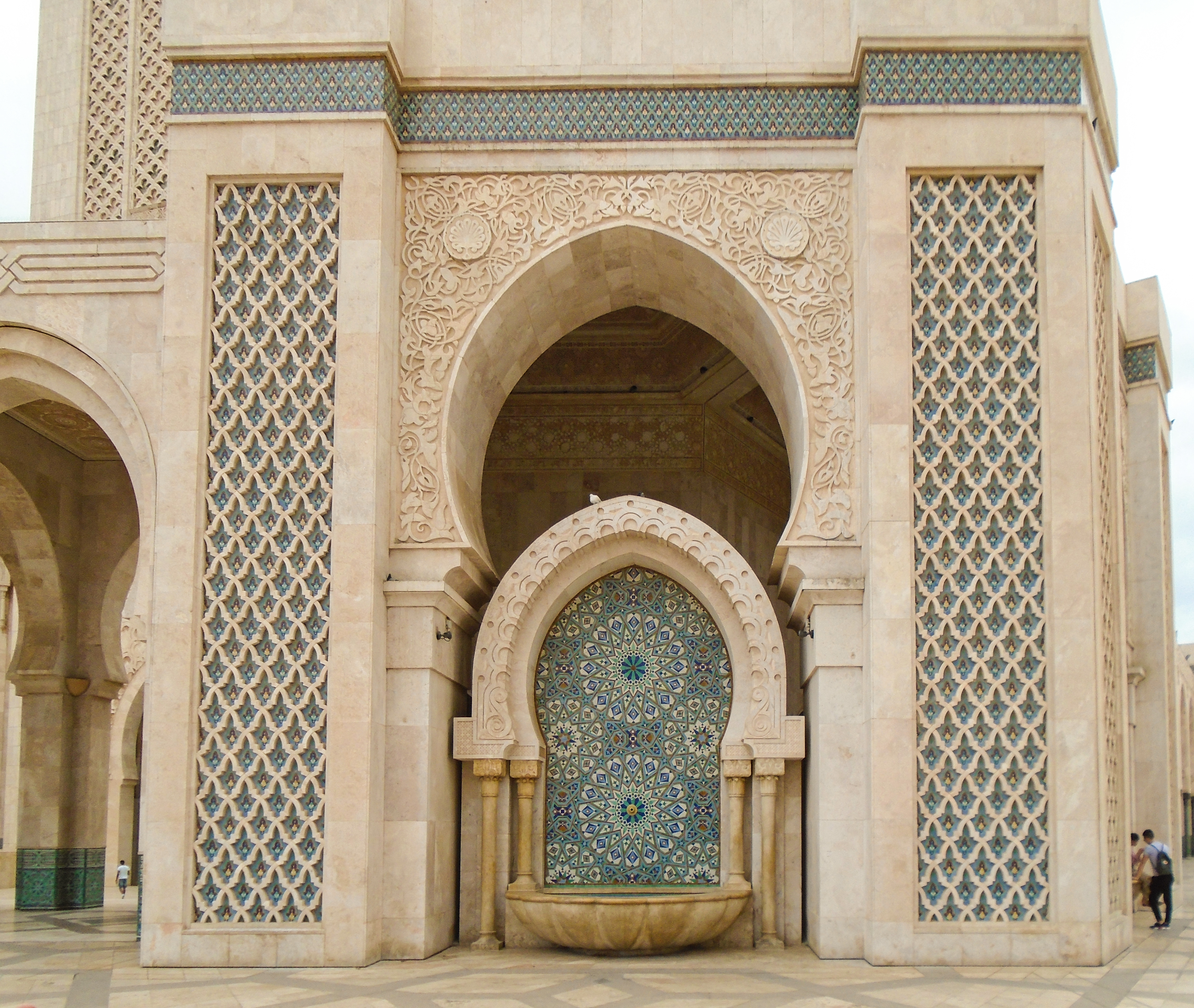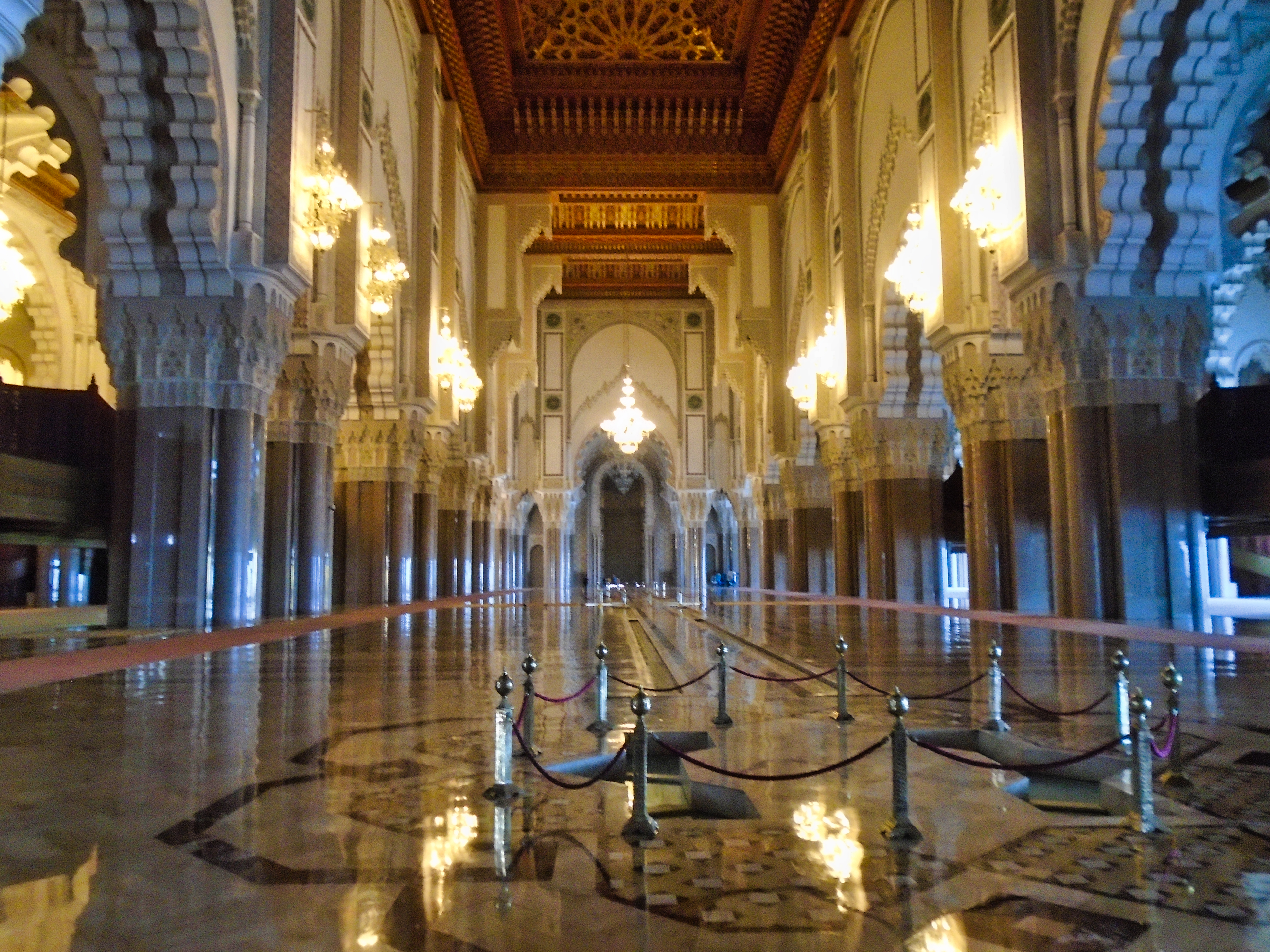 The Hassan II Mosque is the largest functioning mosque in Africa and is the 7th largest in the world. Its minaret is the world’s second tallest minaret at 210 metres. Completed in 1993, it was designed by Michel Pinseau under the guidance of King Hassan II and built by Moroccan artisans from all over the kingdom. The minaret is 60 stories high topped by a laser, the light from which is directed towards Mecca. The mosque stands on a promontory looking out to the Atlantic Ocean; worshippers can pray over the sea but there is no glass floor looking into the sea. The walls are of hand-crafted marble and the roof is retractable. A maximum of 105,000 worshippers can gather together for prayer: 25,000 inside the mosque hall and another 80,000 on the mosque’s outside ground. This stately mosque, a fine example of pure Moroccan architecture, is the only one in the city that non-Muslims may visit. As my wife had bought their typical dress as an suvenir, we didn’t have any problem to visit it. Furthermore, for a small amount of money we had a guide who took us to a different places of this building. Here are some of our recordings...