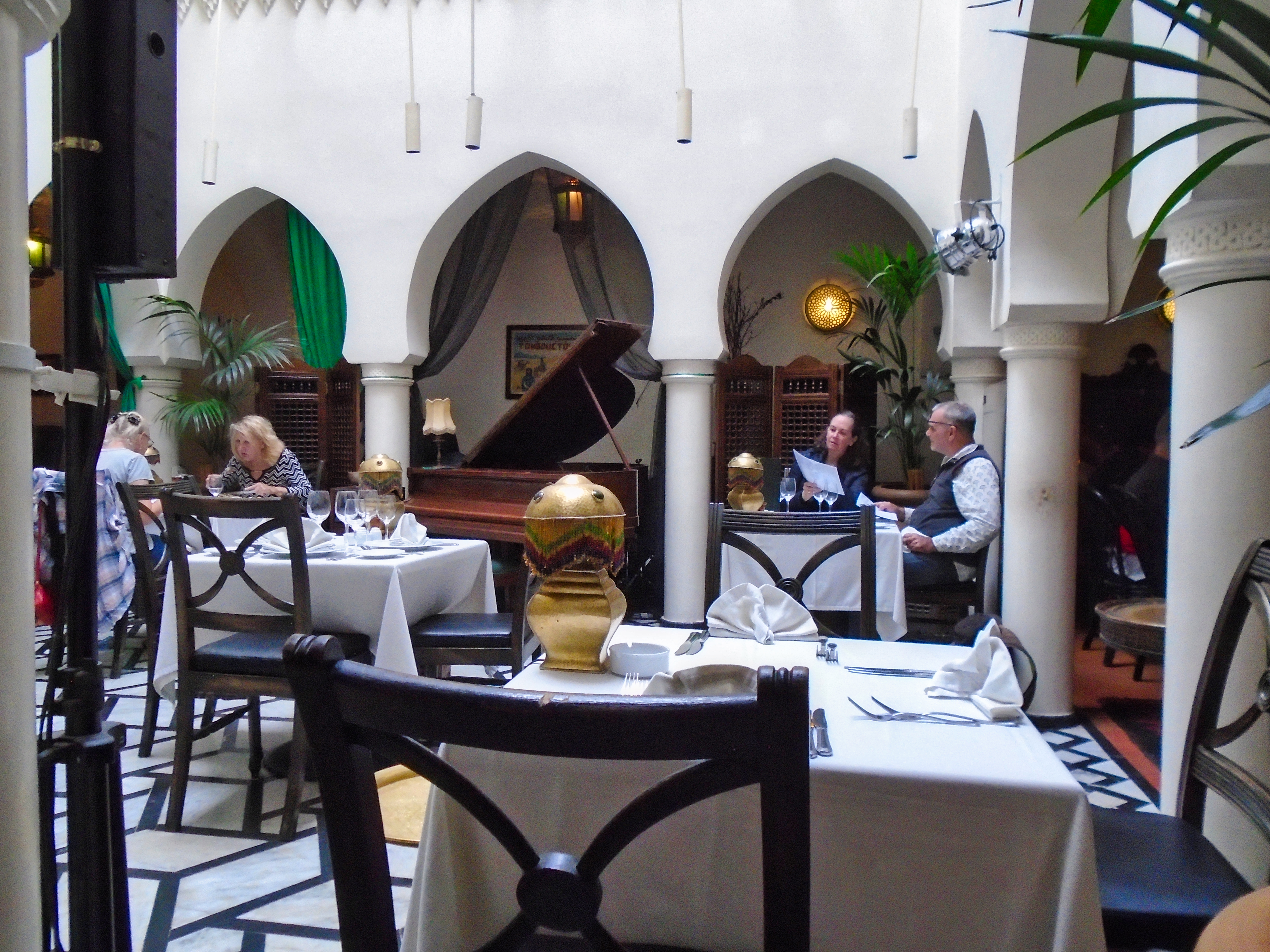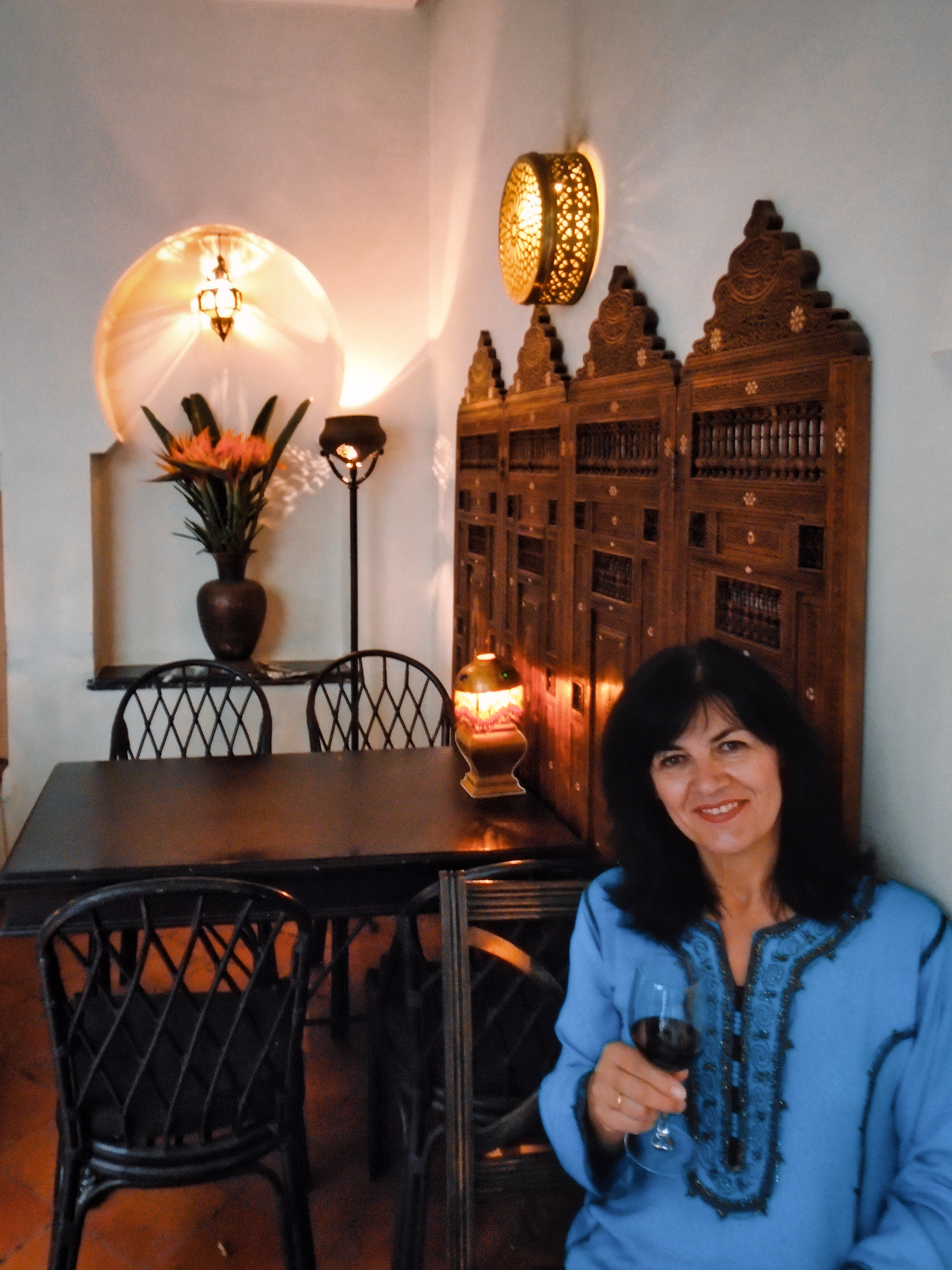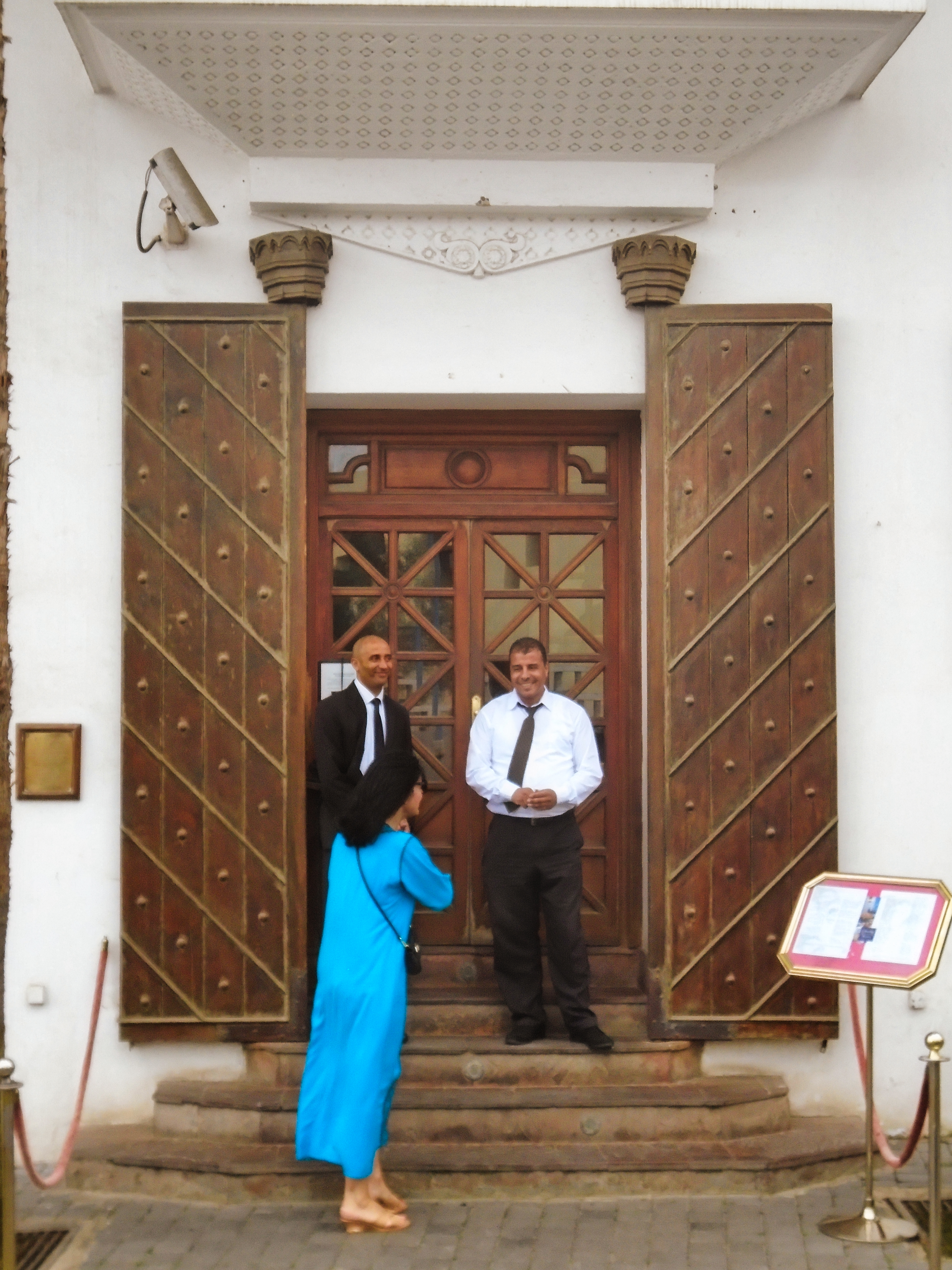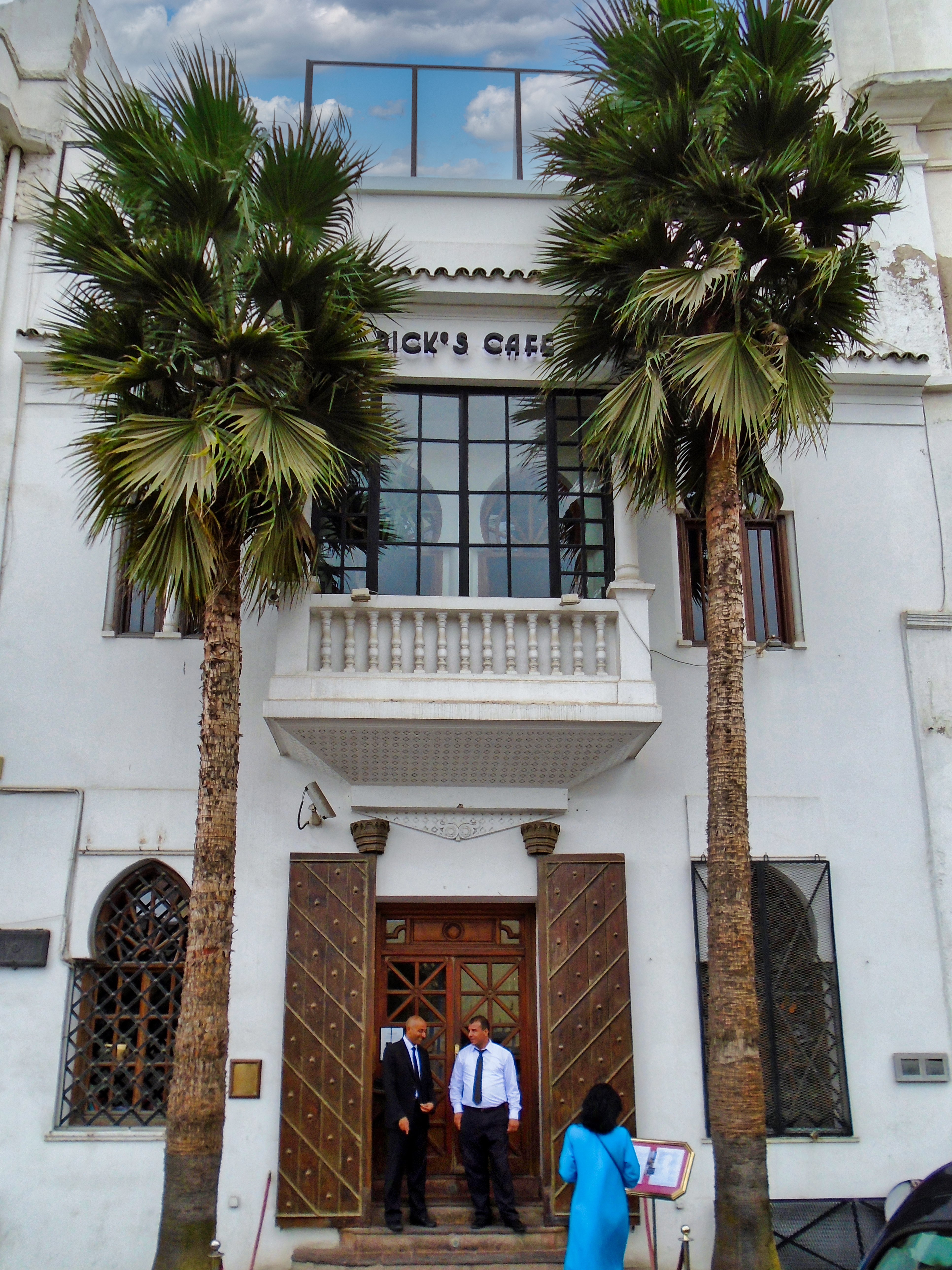 Legendary Rick’s Café Américain is the place designed to recreate the bar made famous by Humphrey Bogart and Ingrid Bergman in the movie classic “Casablanca“. It was 1942, the world was at war, and the eponymous city was occupied by the Axis powers. Rick’s was just the figment of a writer’s imagination. It never existed, except on a Hollywood movie lot, where the classic film starring Humphrey Bogart and Ingrid Bergman was made. The owner and founder of the real Rick’s Café in Casablanca is a former American diplomat, Kathy Kriger (1946 - 2018). Since opened on March 1, 2004, her Rick’s Café seems a success, filling its tables in five dining rooms over two floors for lunch and dinner on most days. At any given sitting there are guests from such a variety of places they would rival the movie’s own very international set of characters, and cast. The incarnation of Rick’s Café has nothing to do with World War II, but a lot to do with the modern-day war on terrorism, and Ms. Kriger’s own small role in it. It also has much to say about the enduring power of a great work of art to affect destinies in real life. Not coincidentally, Ms. Kriger on most nights could be found standing at the corner of the bar, the waiters under instructions to refill her wine glass with water until 11 p.m., when a Moroccan Val d’Argan Blanc is allowed. A lot of the regulars call her ”Madame Rick.” The restaurant is housed in a traditional Moroccan grand mansion with a central courtyard (riad), built in 1930. Two palm trees flank its front door, and the land placement allows for three facades: a distinctive streetfront entrance with heavy wooden doors that depict that of the film; a port-oriented façade that looks to the Atlantic; and a narrow dead-end access which was the former main entrance but is now the service entrance.
