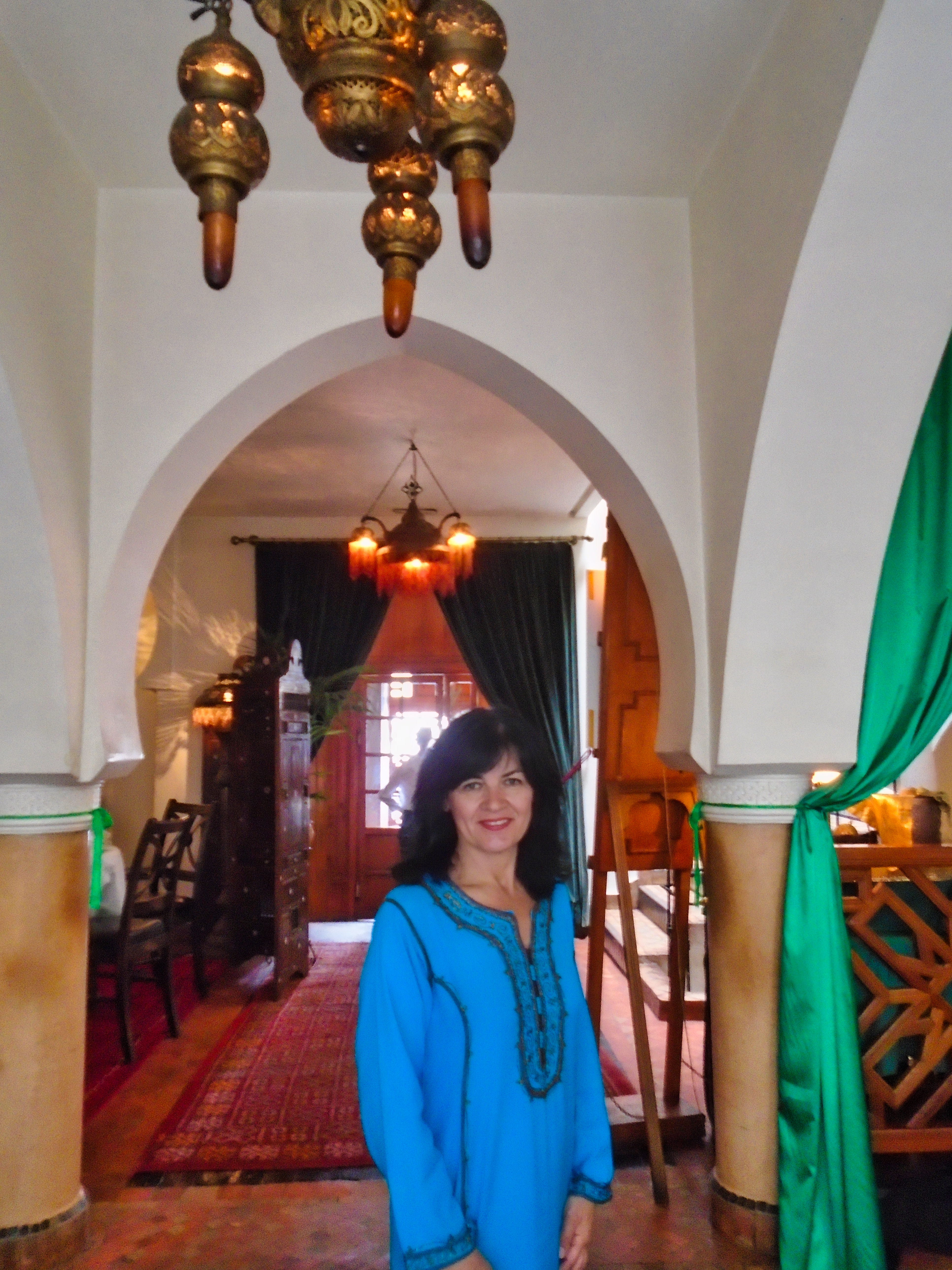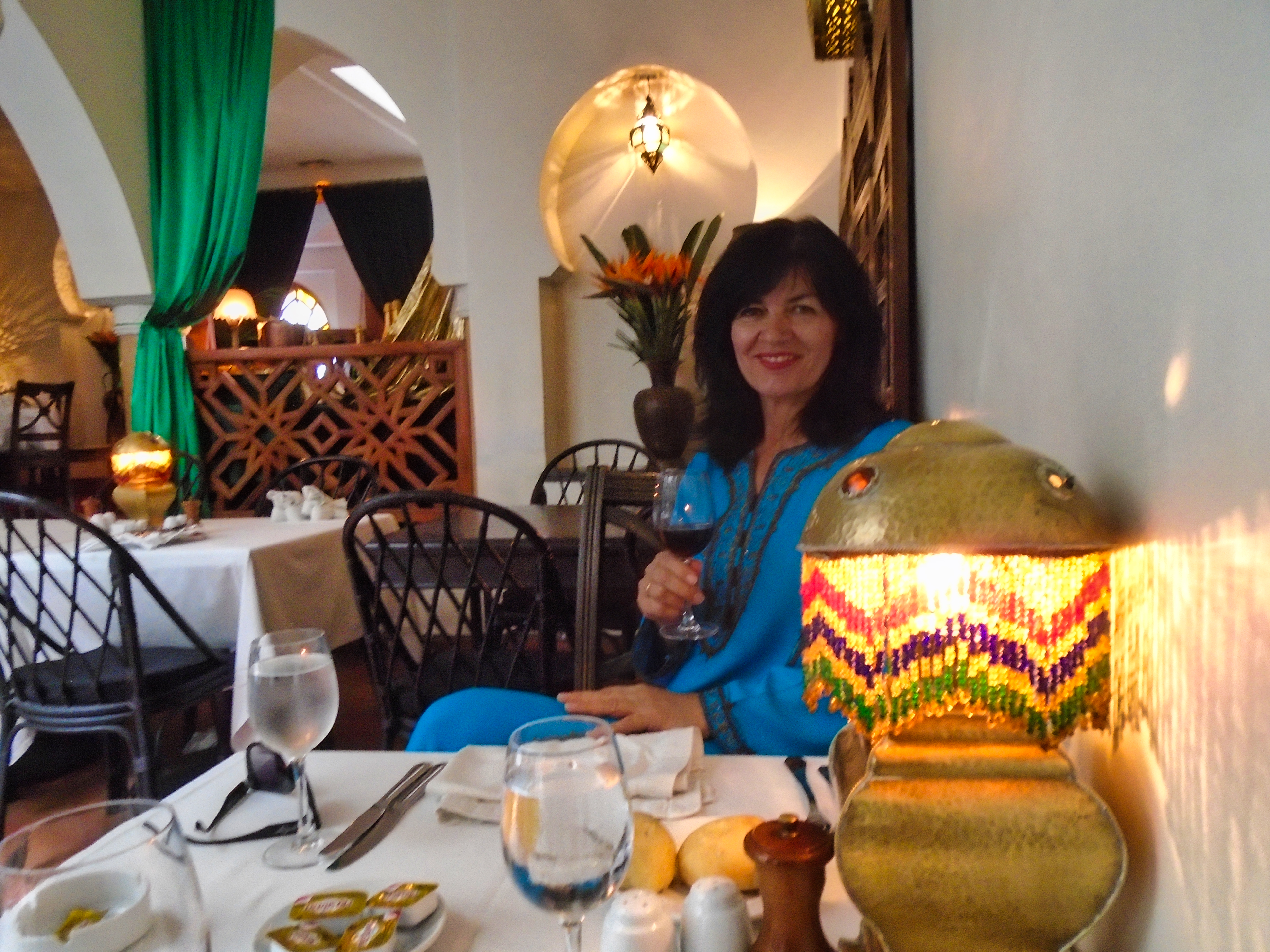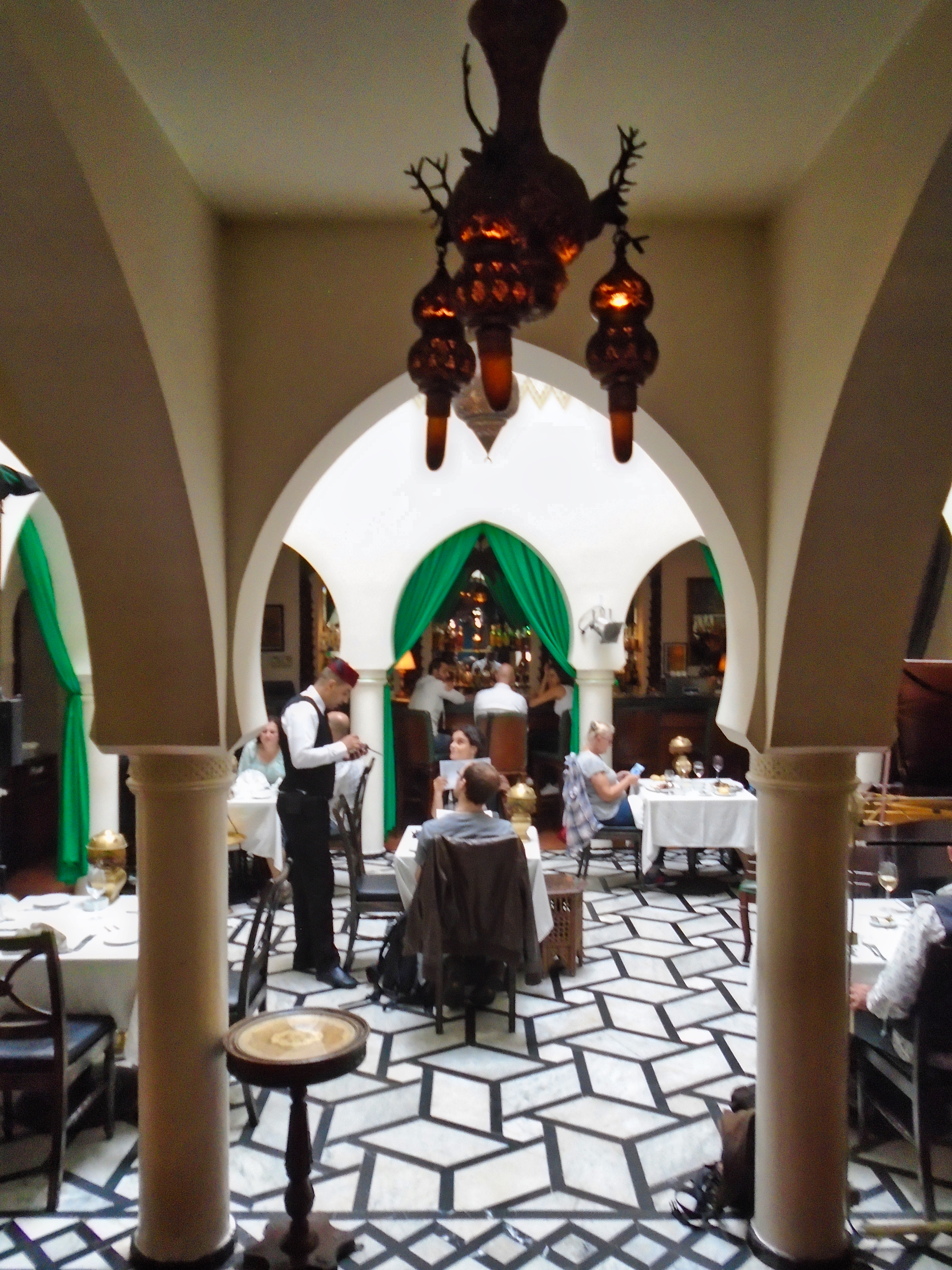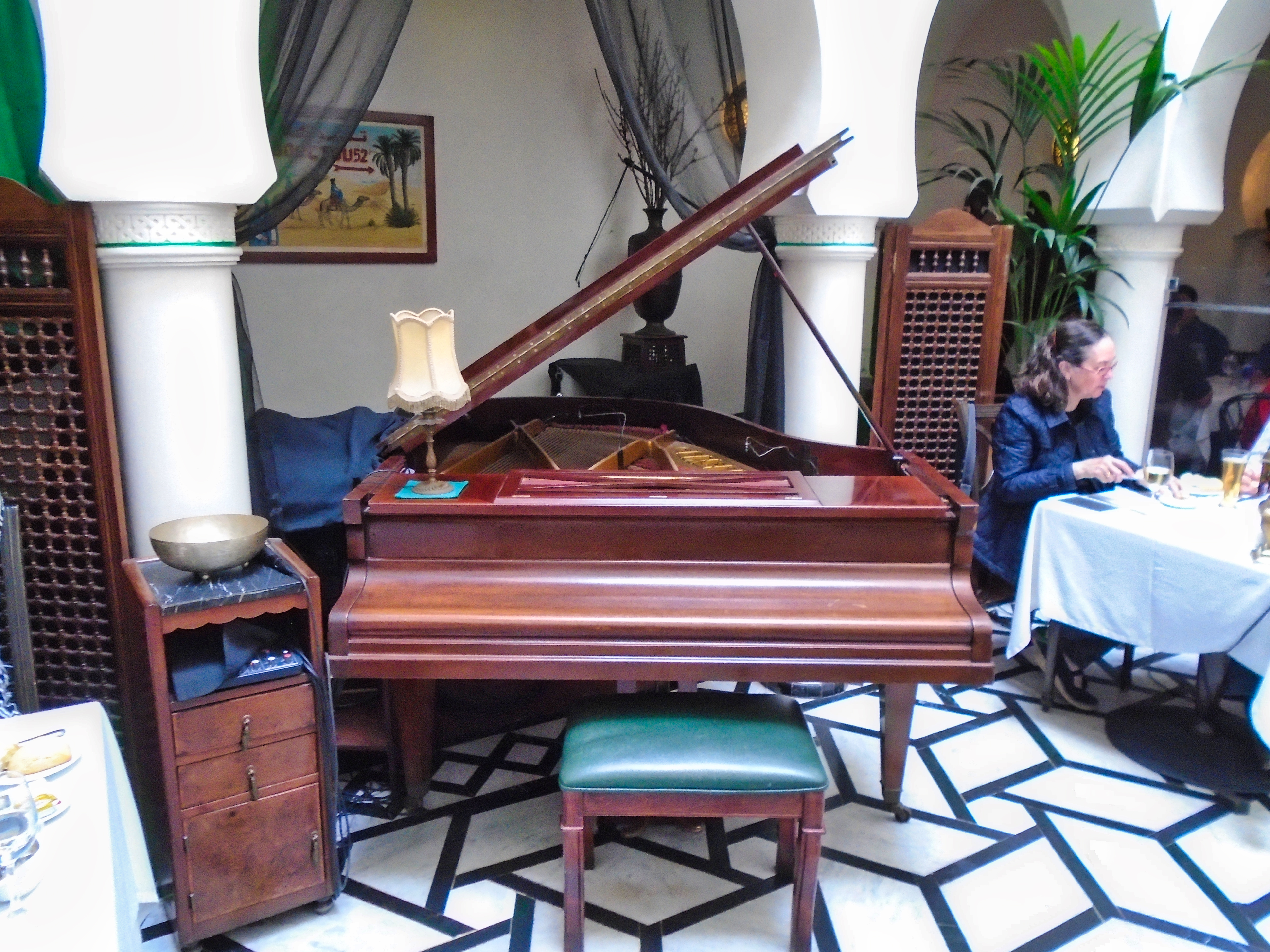 Legendary Rick’s Café Américain is the place designed to recreate the bar made famous by Humphrey Bogart and Ingrid Bergman in the movie classic “Casablanca“. It was 1942, the world was at war, and the eponymous city was occupied by the Axis powers. Rick’s was just the figment of a writer’s imagination. It never existed, except on a Hollywood movie lot, where the classic film starring Humphrey Bogart and Ingrid Bergman was made. The owner and founder of the real Rick’s Café in Casablanca is a former American diplomat, Kathy Kriger (1946 - 2018). Since opened on March 1, 2004, her Rick’s Café seems a success, filling its tables in five dining rooms over two floors for lunch and dinner on most days. At any given sitting there are guests from such a variety of places they would rival the movie’s own very international set of characters, and cast. The incarnation of Rick’s Café has nothing to do with World War II, but a lot to do with the modern-day war on terrorism, and Ms. Kriger’s own small role in it. It also has much to say about the enduring power of a great work of art to affect destinies in real life. Not coincidentally, Ms. Kriger on most nights could be found standing at the corner of the bar, the waiters under instructions to refill her wine glass with water until 11 p.m., when a Moroccan Val d’Argan Blanc is allowed. A lot of the regulars call her ”Madame Rick.” The restaurant is housed in a traditional Moroccan grand mansion with a central courtyard (riad), built in 1930. Two palm trees flank its front door, and the land placement allows for three facades: a distinctive streetfront entrance with heavy wooden doors that depict that of the film; a port-oriented façade that looks to the Atlantic; and a narrow dead-end access which was the former main entrance but is now the service entrance.