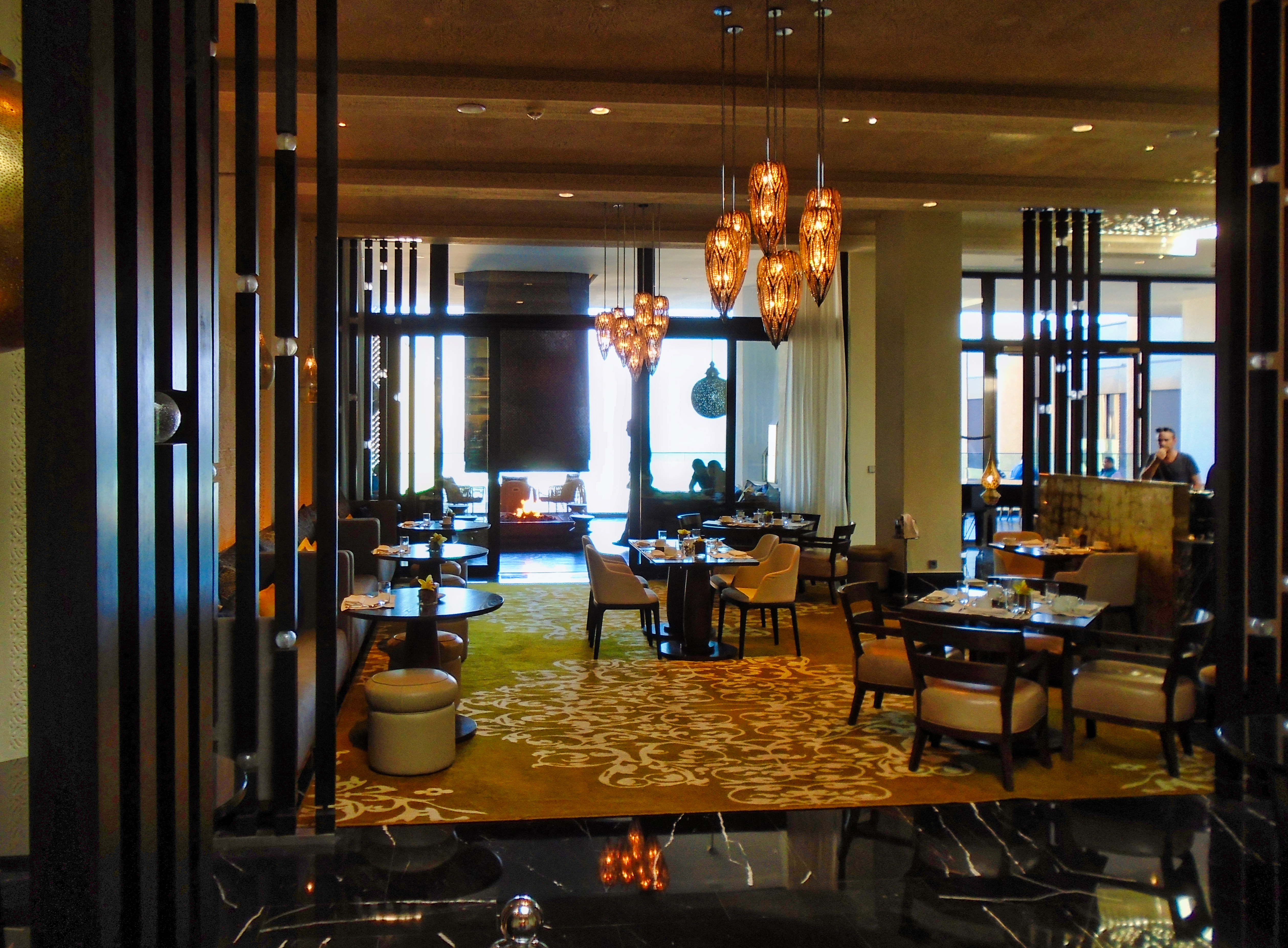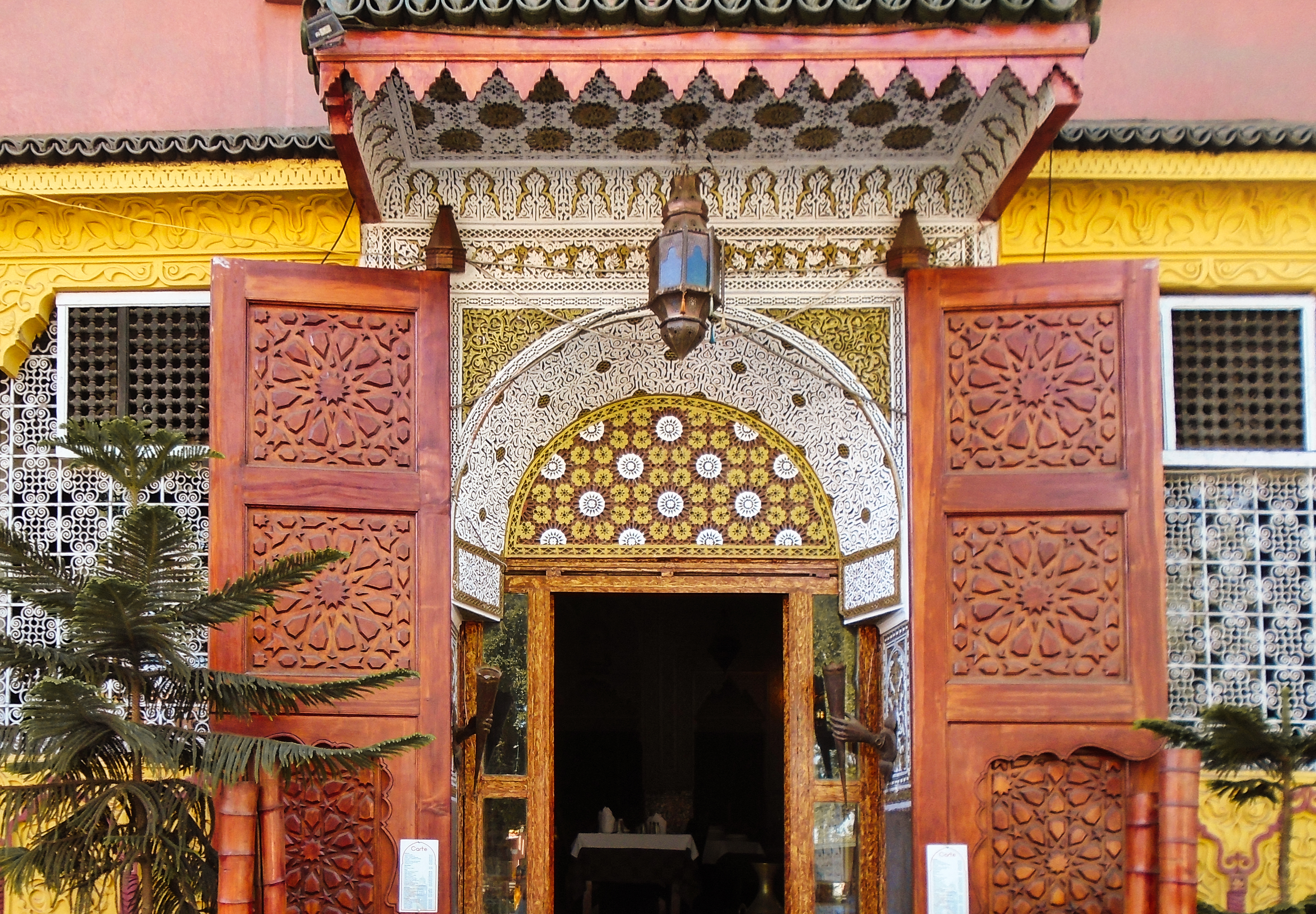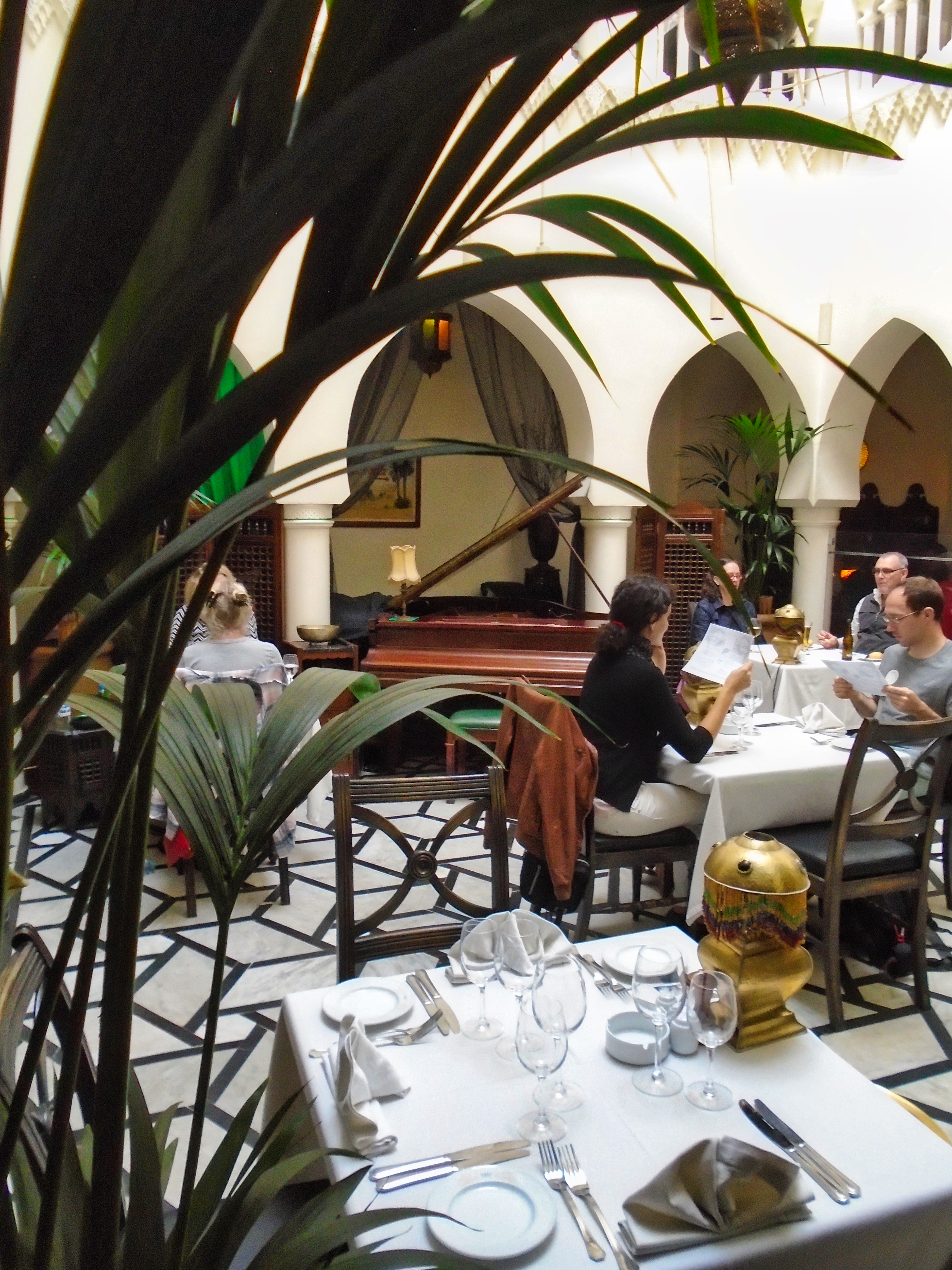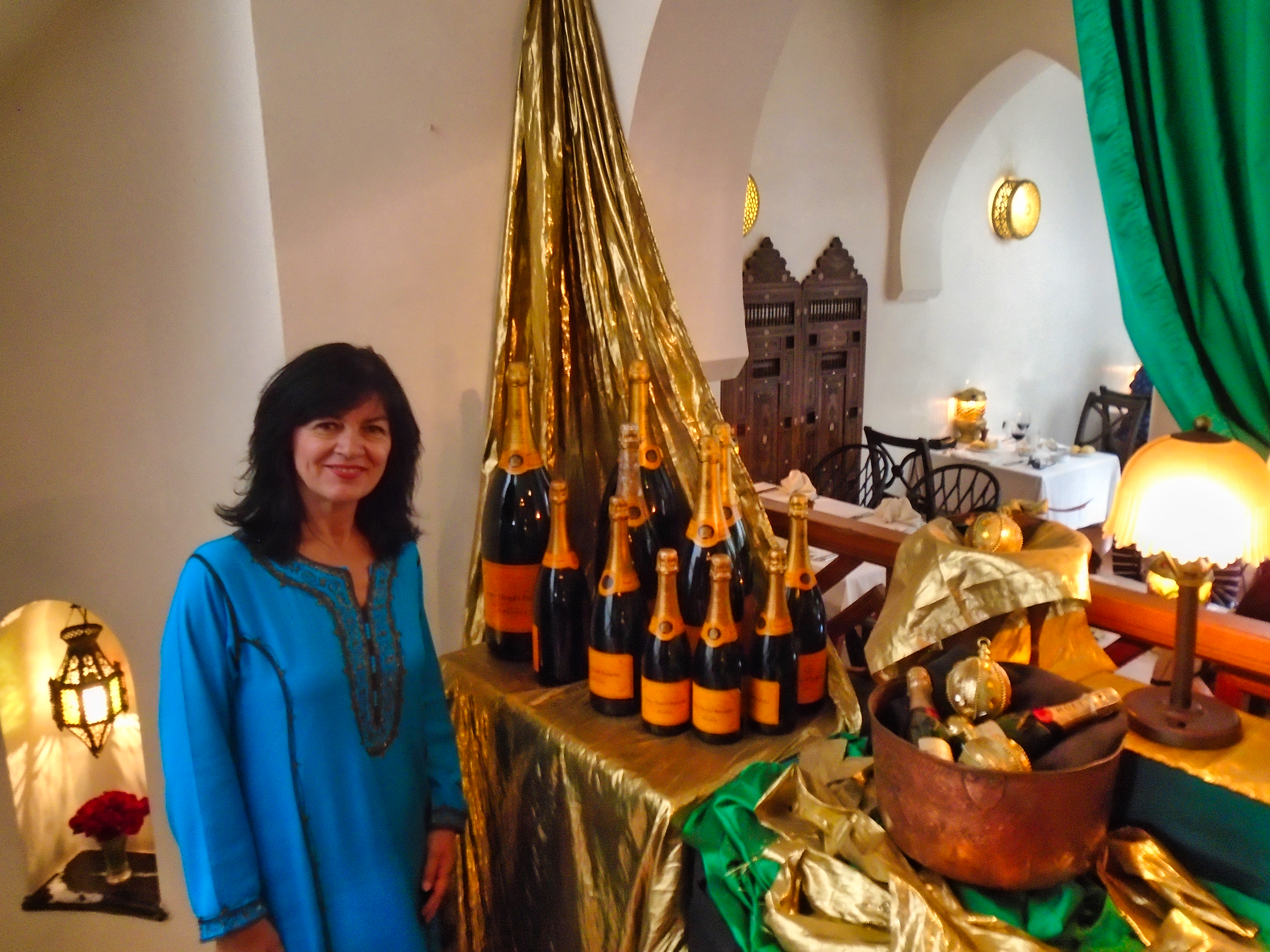 Legendary Rick’s Café Américain is the place designed to recreate the bar made famous by Humphrey Bogart and Ingrid Bergman in the movie classic “Casablanca“. It was 1942, the world was at war, and the eponymous city was occupied by the Axis powers. Rick’s was just the figment of a writer’s imagination. It never existed, except on a Hollywood movie lot, where the classic film starring Humphrey Bogart and Ingrid Bergman was made. The owner and founder of the real Rick’s Café in Casablanca is a former American diplomat, Kathy Kriger (1946 - 2018). Since opened on March 1, 2004, her Rick’s Café seems a success, filling its tables in five dining rooms over two floors for lunch and dinner on most days. At any given sitting there are guests from such a variety of places they would rival the movie’s own very international set of characters, and cast. The incarnation of Rick’s Café has nothing to do with World War II, but a lot to do with the modern-day war on terrorism, and Ms. Kriger’s own small role in it. It also has much to say about the enduring power of a great work of art to affect destinies in real life. Not coincidentally, Ms. Kriger on most nights could be found standing at the corner of the bar, the waiters under instructions to refill her wine glass with water until 11 p.m., when a Moroccan Val d’Argan Blanc is allowed. A lot of the regulars call her ”Madame Rick.” The restaurant is housed in a traditional Moroccan grand mansion with a central courtyard (riad), built in 1930. Two palm trees flank its front door, and the land placement allows for three facades: a distinctive streetfront entrance with heavy wooden doors that depict that of the film; a port-oriented façade that looks to the Atlantic; and a narrow dead-end access which was the former main entrance but is now the service entrance.