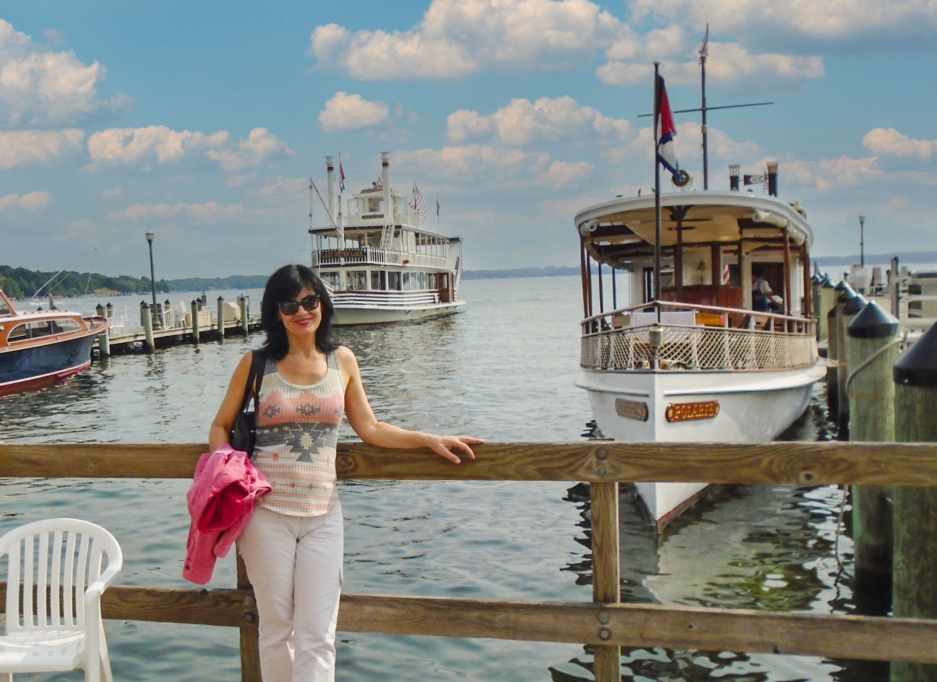 ..and here is how it works: the 75-foot Walworth with a load of 150 passengers, delivers mail and newspapers by moving between the docks and getting close enough to the pier for the Mailperson to jump off the moving boat, deposit the mail in the mailbox, grab outgoing mail, and jump back onto the boat – all while the boat keeps moving. Every delivery is different and challenging both for the Captain and the Mailperson! Sometimes the delivery ends with a splash in the lake!